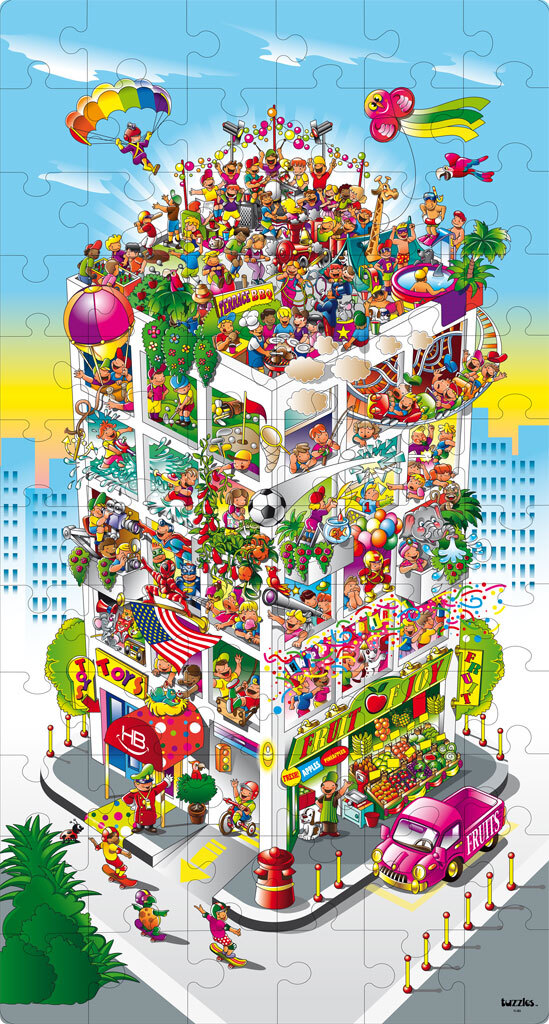 The Happy Apartment Block large wooden Floor Puzzle is a Discovery Puzzle. After completing the puzzle there can be lots of discussion about all the different activities going on in that Apartment Block. Lots of different things to discover and to discuss. This encourages lots of interaction and language development.