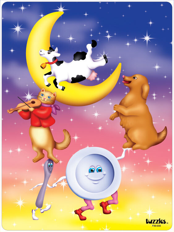 Part of Tuzzles Nursery Rhyme series, Hey Diddle Diddle is a Flat Tray wooden puzzle with shape cut pieces. It is a perfect next step from Raised Tray puzzles