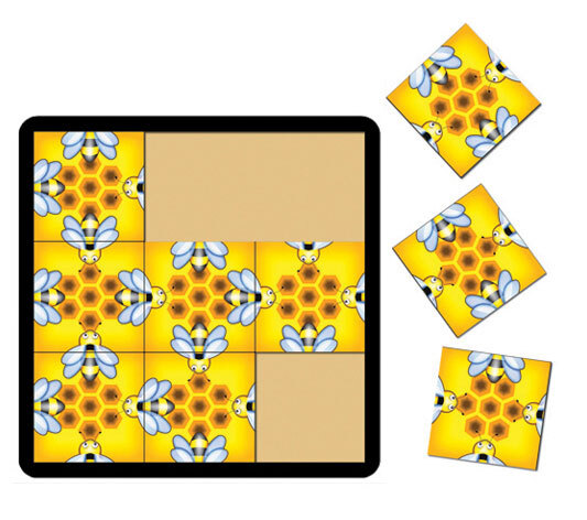 A Grid cut Move and Match Game featuring the honey bee. The pieces are cut into perfect squares and will fit into the frame in any direction and any location so that student has to work out the correct orientation and placement of each piece to complete the game.