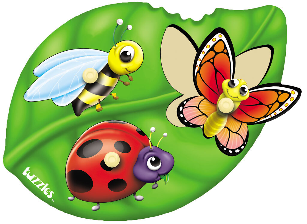 A Wooden Peg Puzzle cut into the shape of a leaf. The puzzle features insects that are found in most gardens and are familiar and exciting. The bright and colour imagery invites children to play as they practice their early developmental skills.