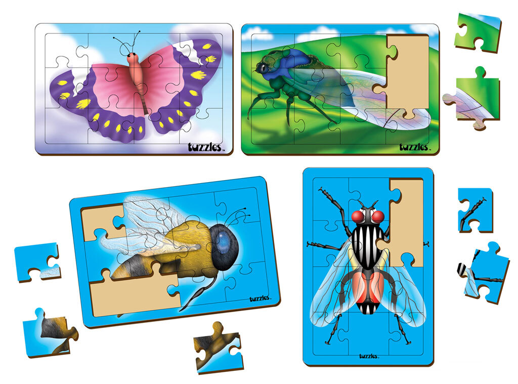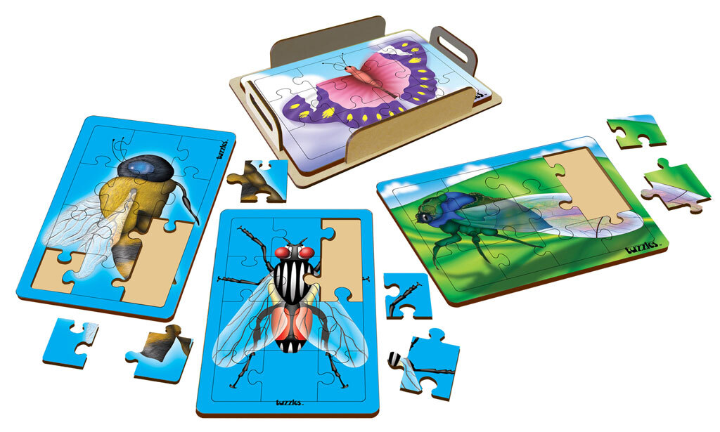 This Set of 4 wooden Flat tray puzzles have been cut into the larger size of 200mmx300mm. They show images of A Honey Bee, A Cicada, A Butterfly and a House Fly.