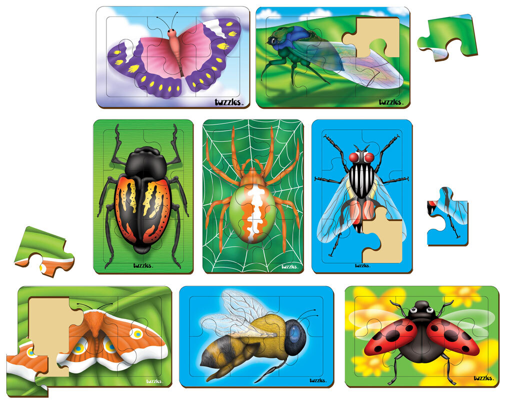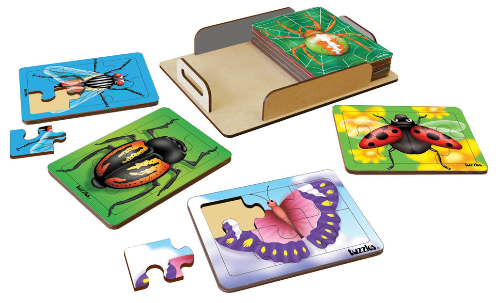 A set of 8 Flat Tray wooden puzzles featuring different Insects. These puzzles come in a wooden storage tray.