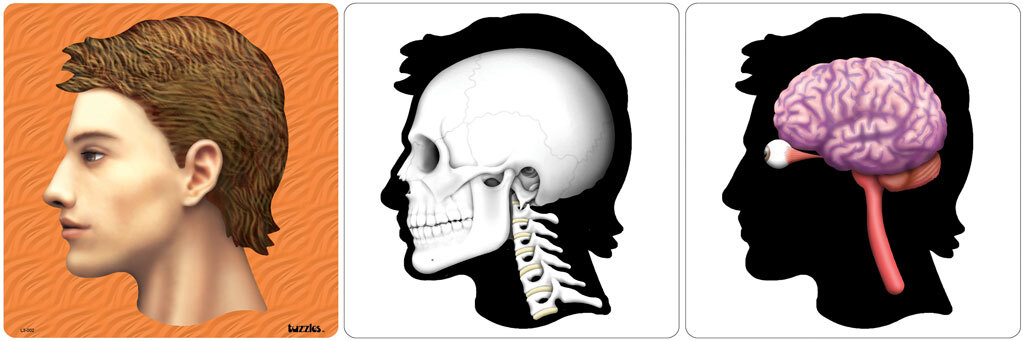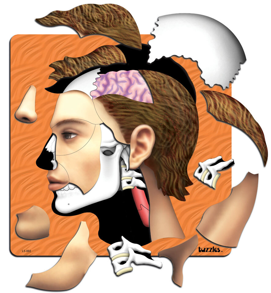 This 3 layer wooden puzzle is a learning tool to help children understand the internal structure of the human head. Each layer from the Skin to the Brain is carefully depicted to show the placement of vital parts. Each layer is a complete puzzle in itself and all the pieces including the skull may be removed from the puzzle.