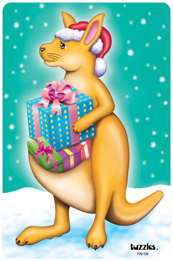 A Flat Tray wooden puzzle depicting a Kangaroo dressed as Santa carry the presents in his pouch. This whimsical puzzle was designed to add fun to the learning experience and to help children learn about "Thinking outside the box". Shape cut pieces make this puzzle both fun and a complete learning experience.