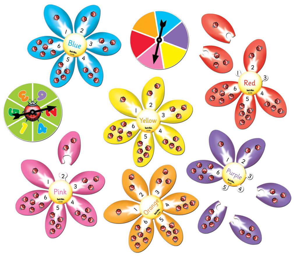 A game played with 1 or 2 spinners. The first person to collect all their pieces wins. The game may be played initially as a colour matching game by using just the one spinner, then add the second numbers spinner to add a higher level of complexity.