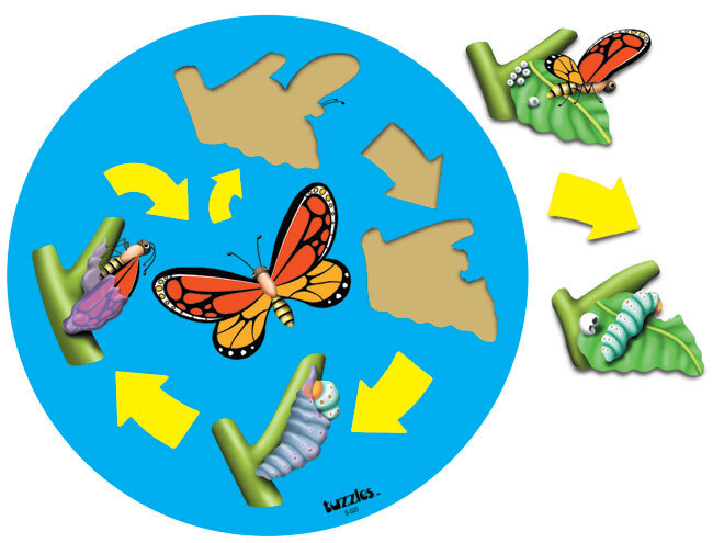 Follow the Life Cycle of the Butterfly from Caterpillar to Butterfly using this Raised piece wooden puzzle. The yellow arrows show the sequence and the raised pieces make it easier for children to manipulate them. Children learn as they play with this beautifully raised puzzle.