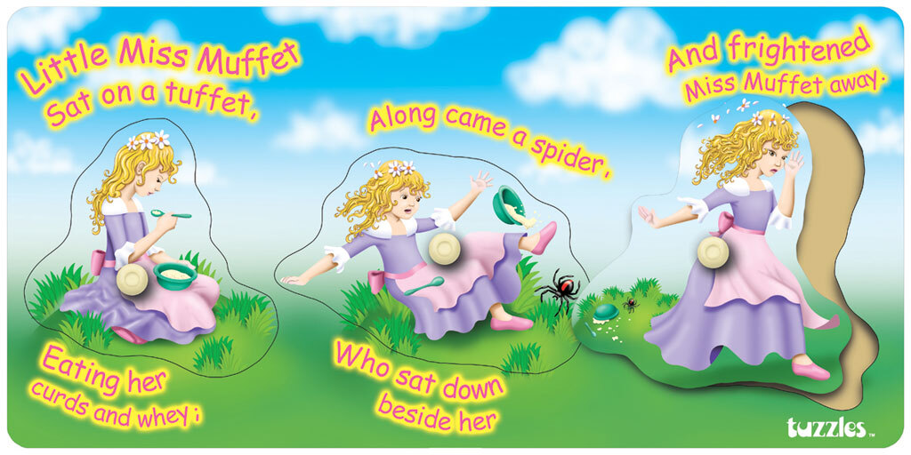 A quality wooden peg puzzle with the theme Little Miss Muffet. A great first puzzle for the young child to encourage them to develop their fine motor and manipulation skills. This puzzle promotes early learning concepts.