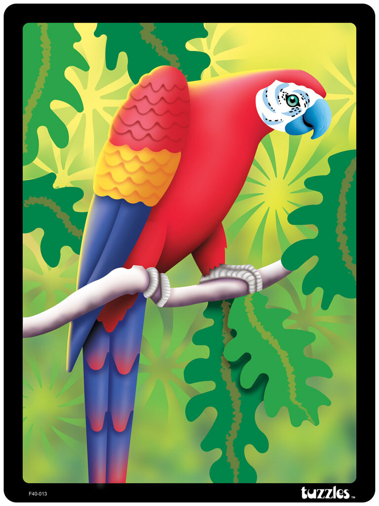 A beautifully illustrated puzzle showing the wonderful Macaw parrot. This large Flat Tray wooden puzzle has 43 pieces and is a Tuzzles ‘Challenge Puzzle’ especially made for those who demand a greater test of skill. This puzzle is also an environmental awareness tool, helping to invoke thought and discussion about important topics. Macaws are native to Mexico, Central and South America and their rainforest habitat is being destroyed at alarming rates, therefore we must all become more aware of how we can help species like the Macaw. Tuzzles puzzles are proudly made in Australia using renewable timber from plantation.