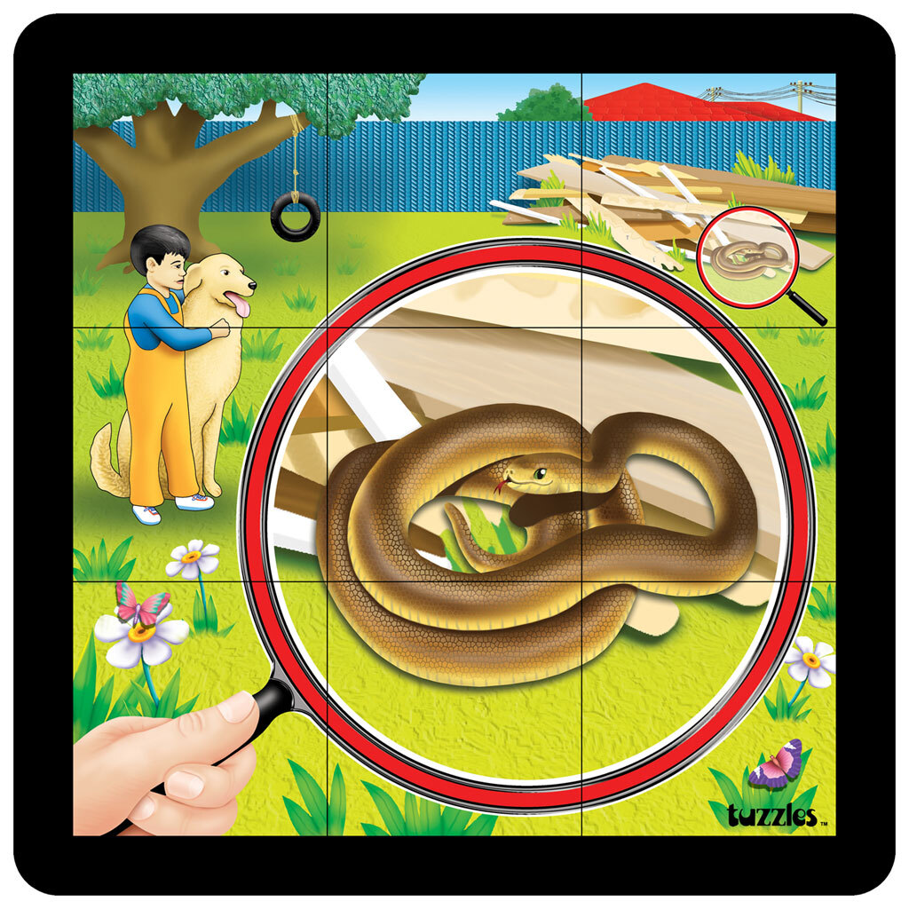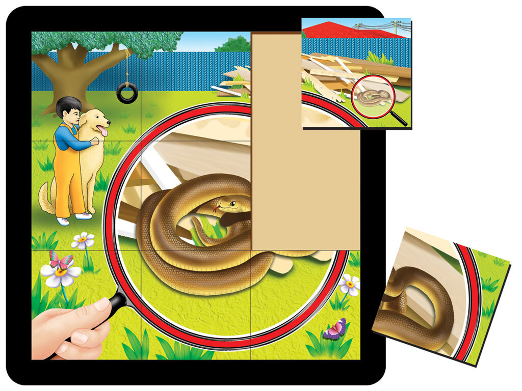 A Flat Tray wooden Grid puzzle Magnified Dangers shows a puzzle with part of the picture magnified so that it is easier to see. The Grid puzzle cut makes the puzzle a challenge as children have to use both spacial awareness and also colour matching to locate the piece into the correct position. This puzzle features a brown snake and it has been emphasized to feature the danger.