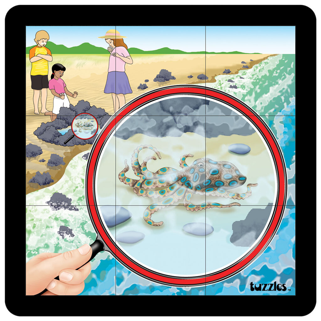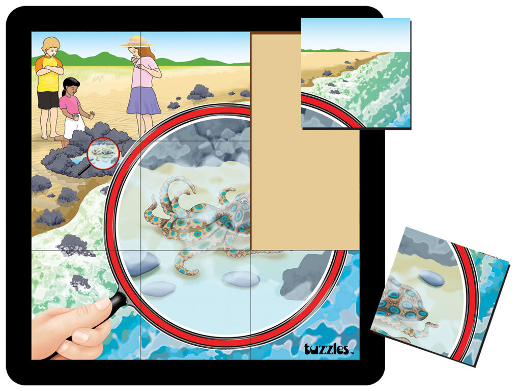 Another Discovery puzzle Magnified Rock Pool is a Flat tray wooden puzzle showing a magnified section of what can be discovered in a rock pool. Understanding our world is an important learning experience and also being able to discover the dangers lurking without the hurt makes this puzzle interesting and informative.