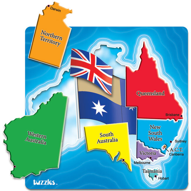 A Flat Tray 2-Layer puzzle depicting Australia,our states and territories with the second layer depicting the Australian Flag. This is a great puzzle to not only have children practicing their fine motor and other cognitive skills but also to teach them about their own country.