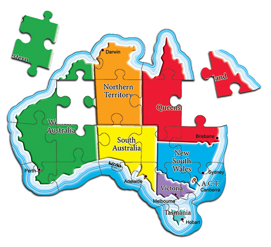 A 19 piece Map of Australia Floor/Table Puzzle This table puzzle is a free form puzzle that will fit onto a table top of a desk. It is the same design as our Giant Floor puzzle version, but when lack of space is an option this Table Puzzle will do the job. The pieces are still chunky and this table puzzle has been cut in a free form manner so that the image is not contained by a frame and the positive and negative space recognition is different to a Tray puzzle and therefor extends the learning of this very important skill.
