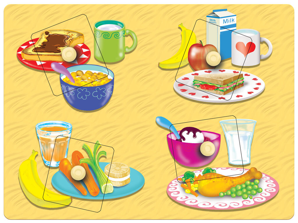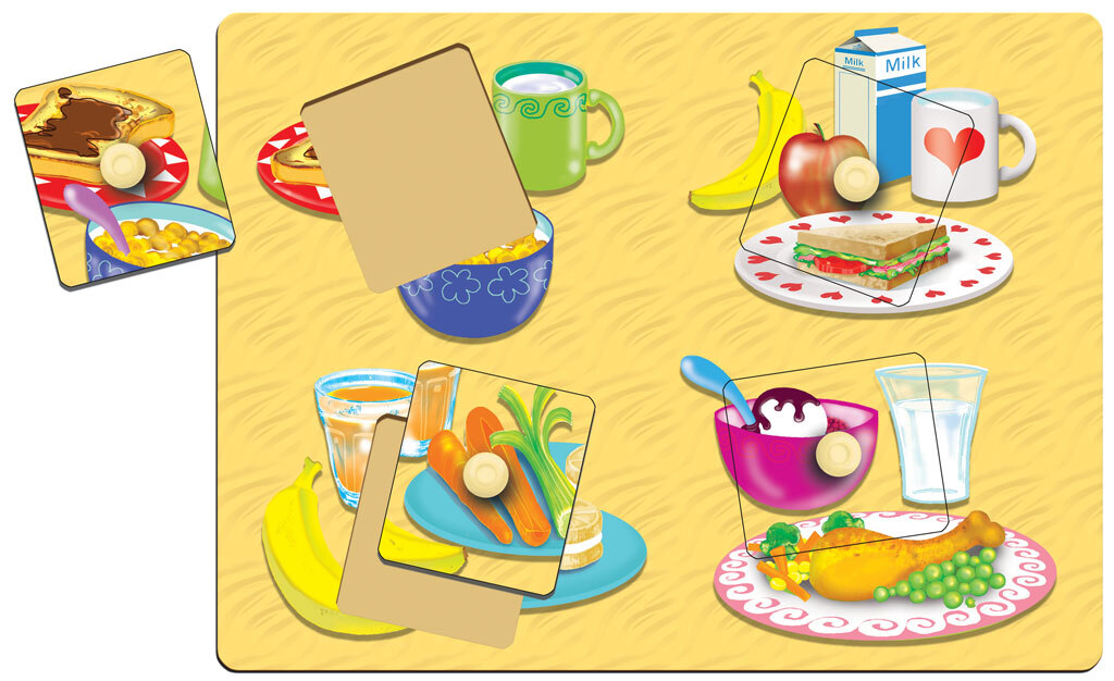 A Single Piece Wooden Peg Puzzle Meal Time shows different combinations of food. The cutout square pieces can be located in any hole, but the right selection puts the meal together. This puzzle is great for learning the basic skills but also to encourage good food selections and to encourage positive conversations on good food choices.