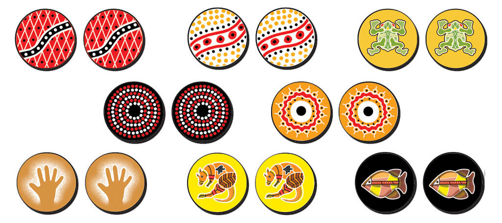 A set of 16 Aboriginal art style Memory Match tokens, for use with the Tuzzles Memory Match Game. The different Tokens depicting cave painted Animals, Dots and Patterns will help children to improve their visual memory skills and concentration as they identify each hidden pair.