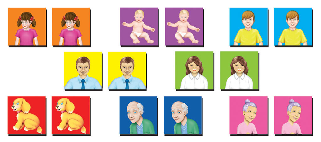 A set of 16 brightly coloured Memory Match Tokens for use with the Tuzzles Memory Match Game. Tokens featuring different family members will help children to improve their visual memory skills as they identify each hidden pair of family members.