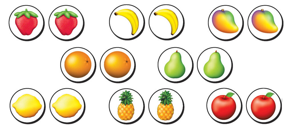 A set of 16 brightly coloured Memory Match Tokens for use with the Tuzzles Memory Match Game. Lots of different Fruits will help children to improve their visual memory skills as they identify each hidden pair of different fruits.