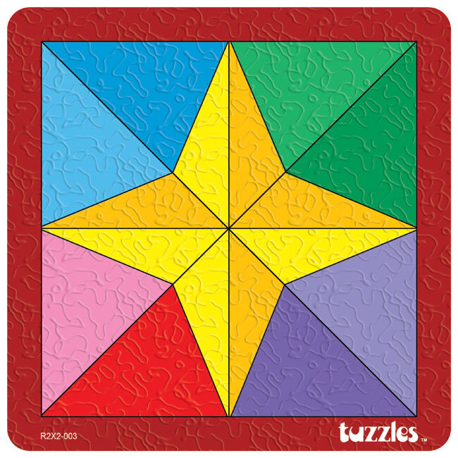 This Mosaic Raised Tray wooden puzzle features a star in two colours of light and dark yellow. The pieces are all precision cut and may be arranged in alternate ways to create different visual effects. The pieces are raised to allow easier manipulation of the pieces and the pieces may be taken out of the tray and used on a flat surface to form different patterns.