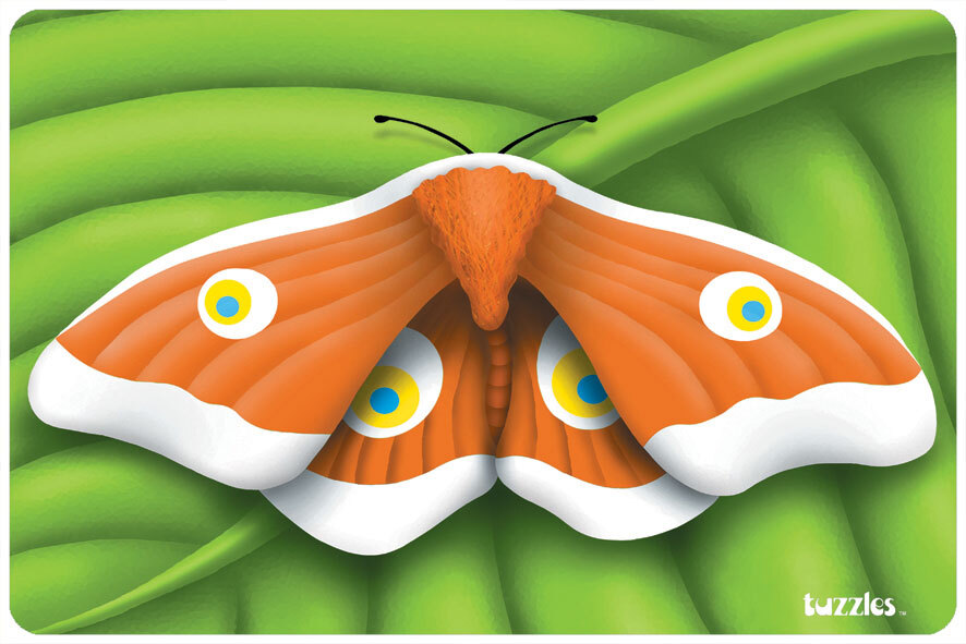 A Flat Tray wooden puzzle of a Moth cut into shape pieces and part of the Tuzzles mini beasts and Insects learning puzzles.