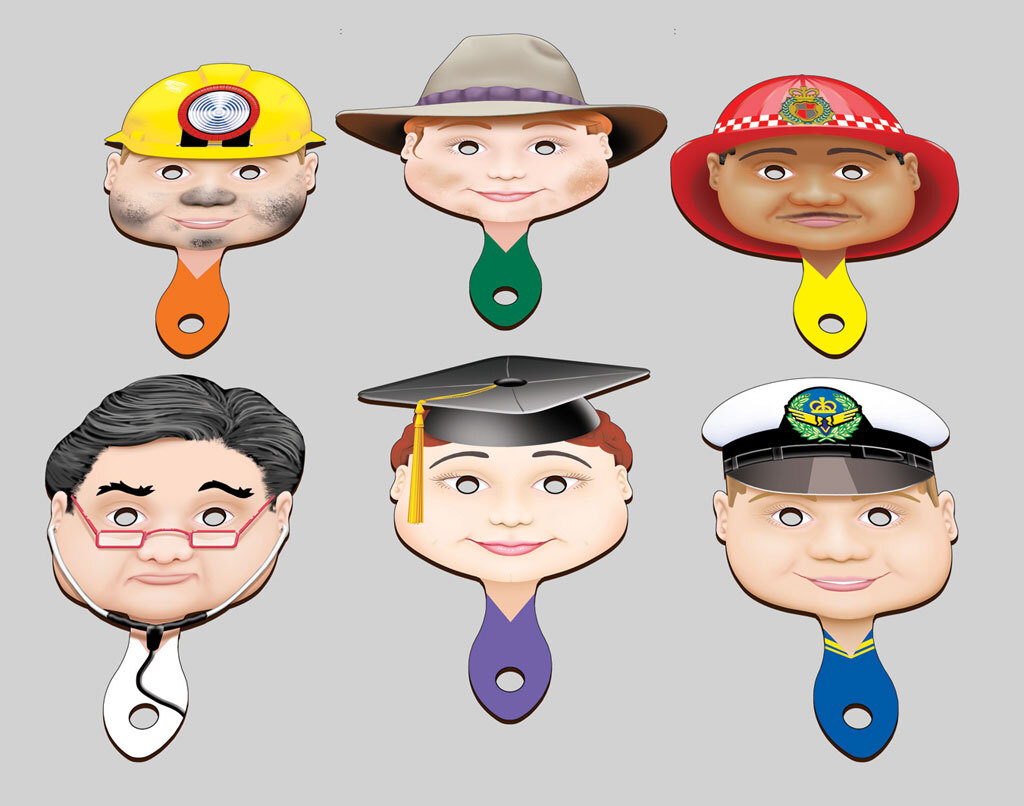 Fireman, Educator, Pilot, Farmer, Miner, Doctor. Encourage children to role play while using this set of 6 realistic wooden face paddles. Children will develop story telling skills and confidence in front of a group, while gaining insight into the various occupational roles of community members in the world around them.