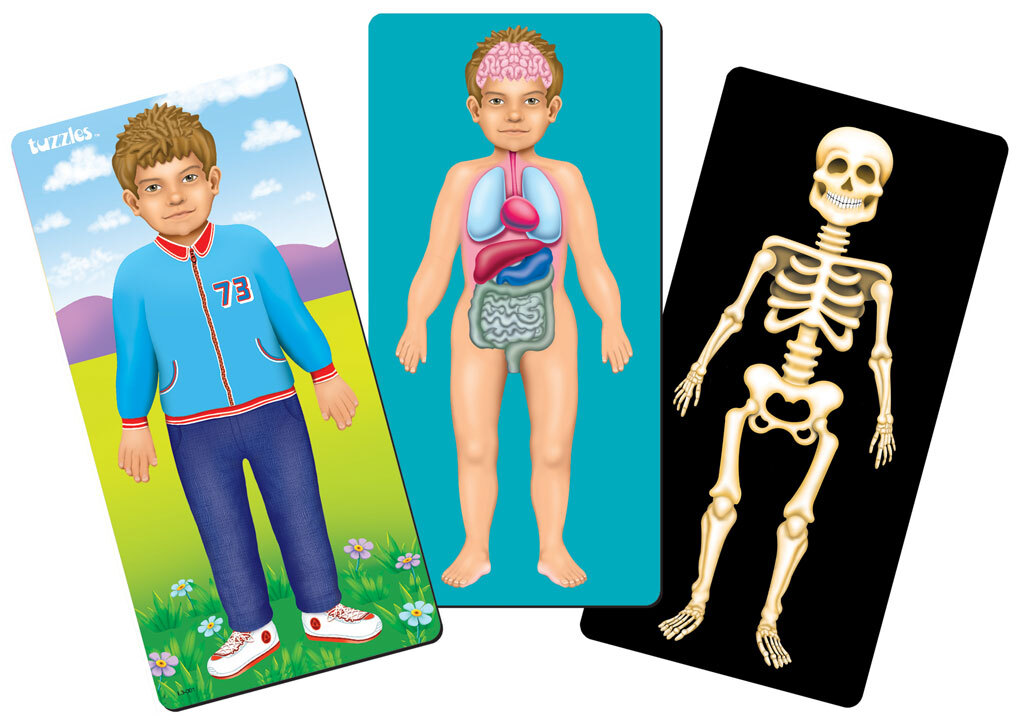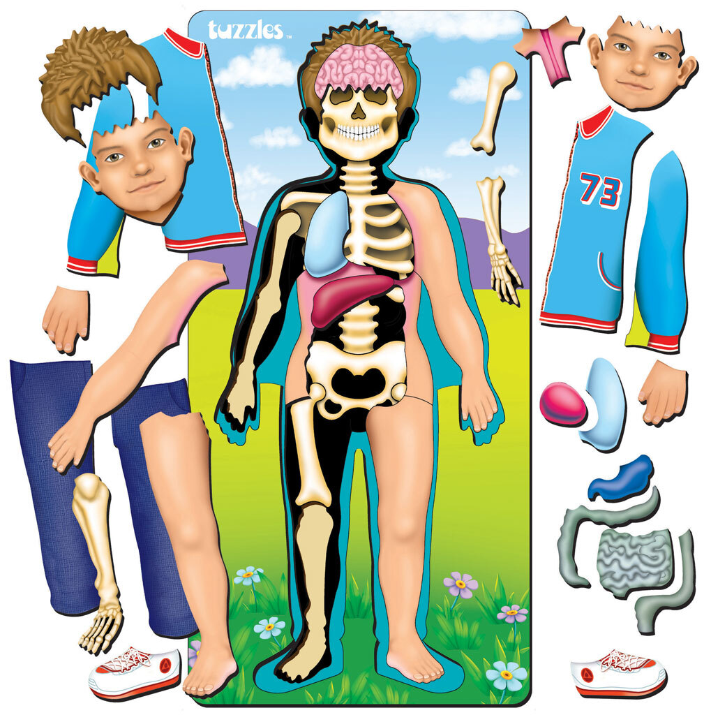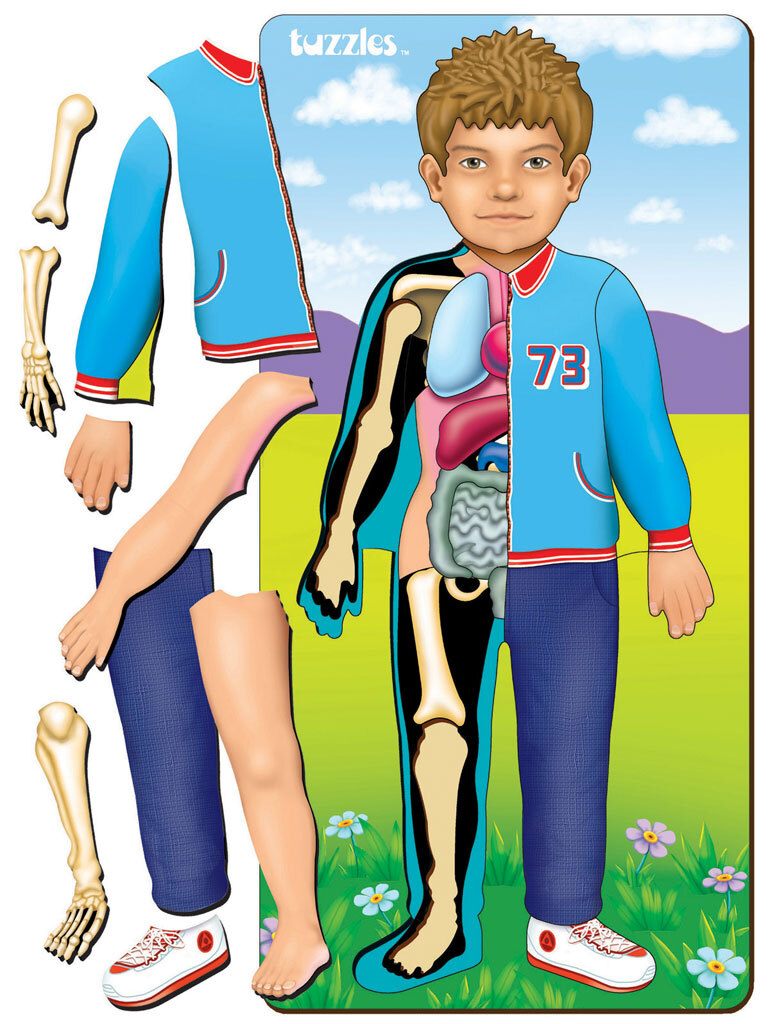 This puzzle has 3 layers, Skeleton, Organs & Clothes. Each layer is a puzzle, all the pieces of the skeleton need to be assembled, then the organs and the brain and last of all the clothes. This puzzle has been designed to teach children about the human body. This is not a puzzle of a girl or a boy but it is the depiction of a Human.