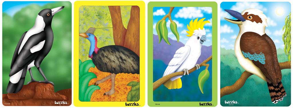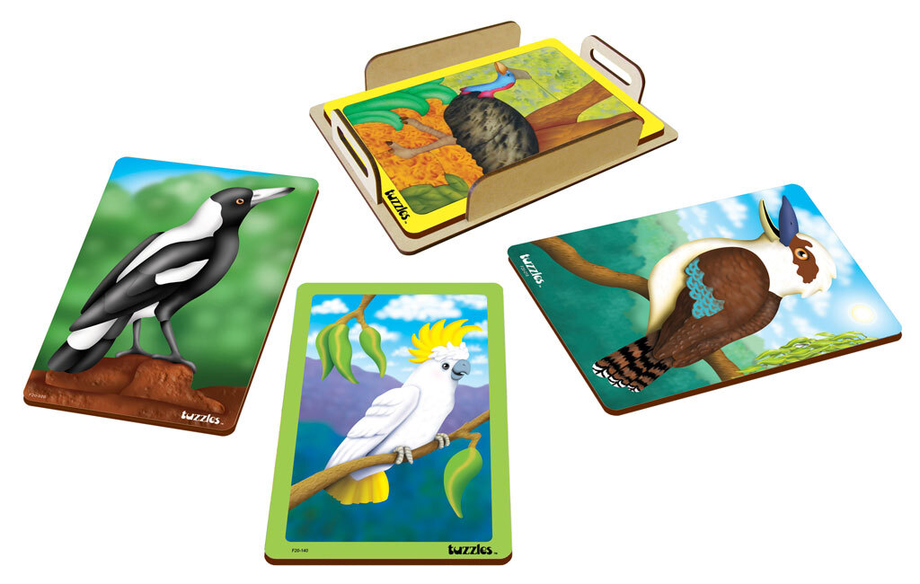 This set of 4 puzzles depicts the Sulphur Crested Cockatoo, the Kookaburra, the Magpie and the Cassowary. The set comes in a storage tray for easy transportation. The puzzles have a harder degree of difficulty and show the birds in their own environment.