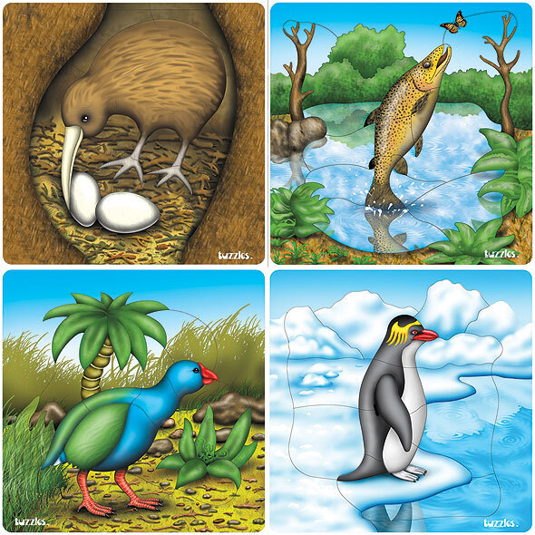 A set of 4 Raised Piece Puzzles showing different birds and animals found in New Zealand.