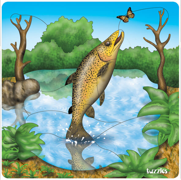A raised puzzle of a Rainbow Trout jumping from the water to catch it's dinner. The pieces are raised to help small fingers move the pieces into position.