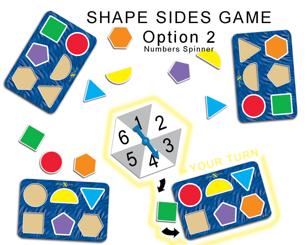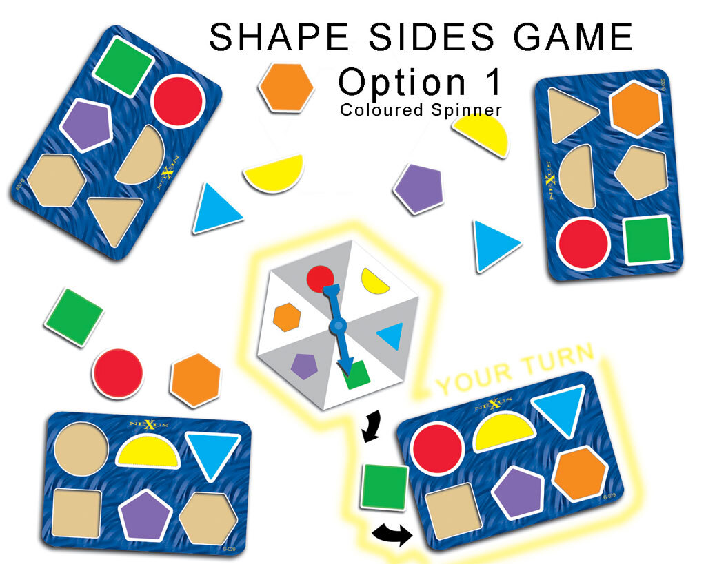 The Shape Sides Game is a shape recognition game which makes learning fun. It comes with 4 game boards and 2 spinners for 2 different types of game play. Spin a 1-put in the circle, 2- the half circle 3-the triangle and so on through all six shapes. Use the coloured shape spinner for a more simple version. An early maths game helping children to easily recognise and remember shapes and the number of sides they have.