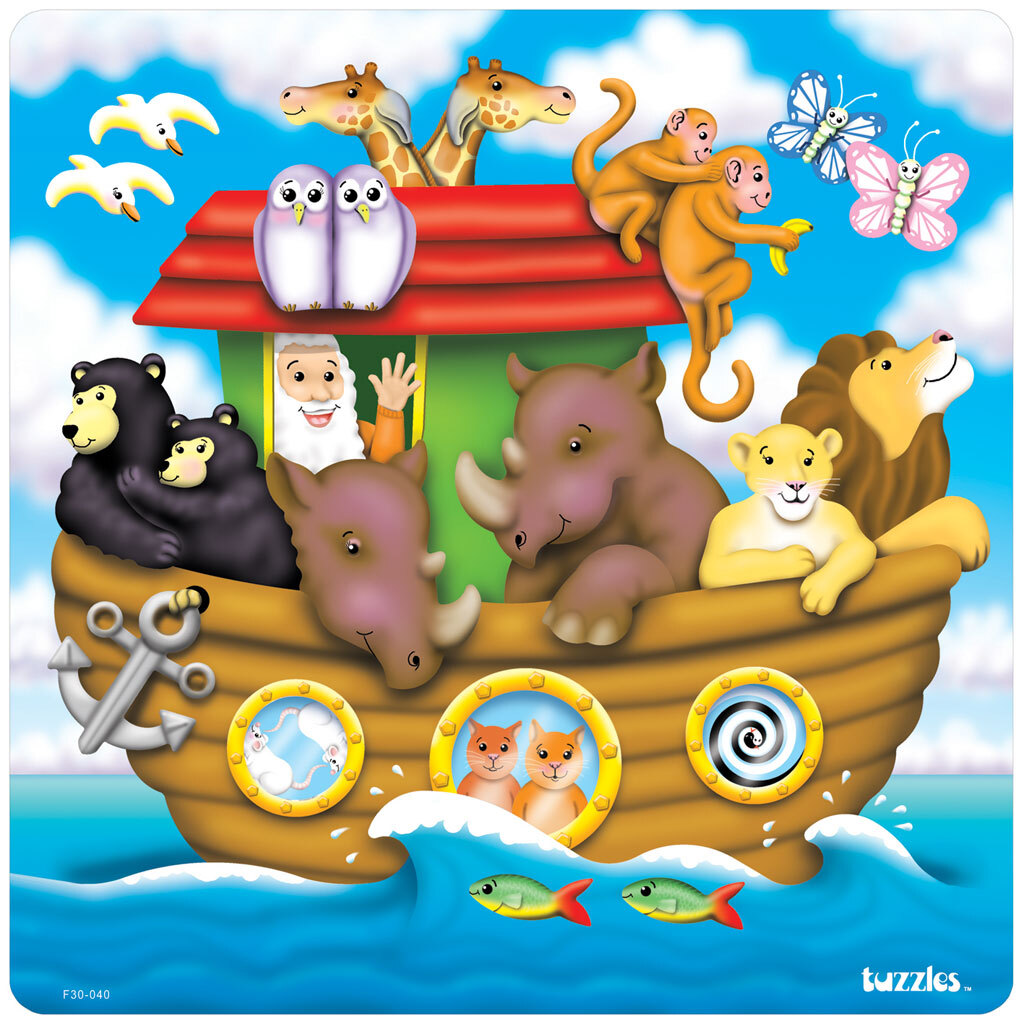 A more difficult Tuzzles Cut jigsaw, this puzzles depicts Noah and his animals on the high seas. This story is a fascination for people of all ages and these bright and colourful images invite children to play. A Flat Tray wooden puzzle called Noah's Ark.