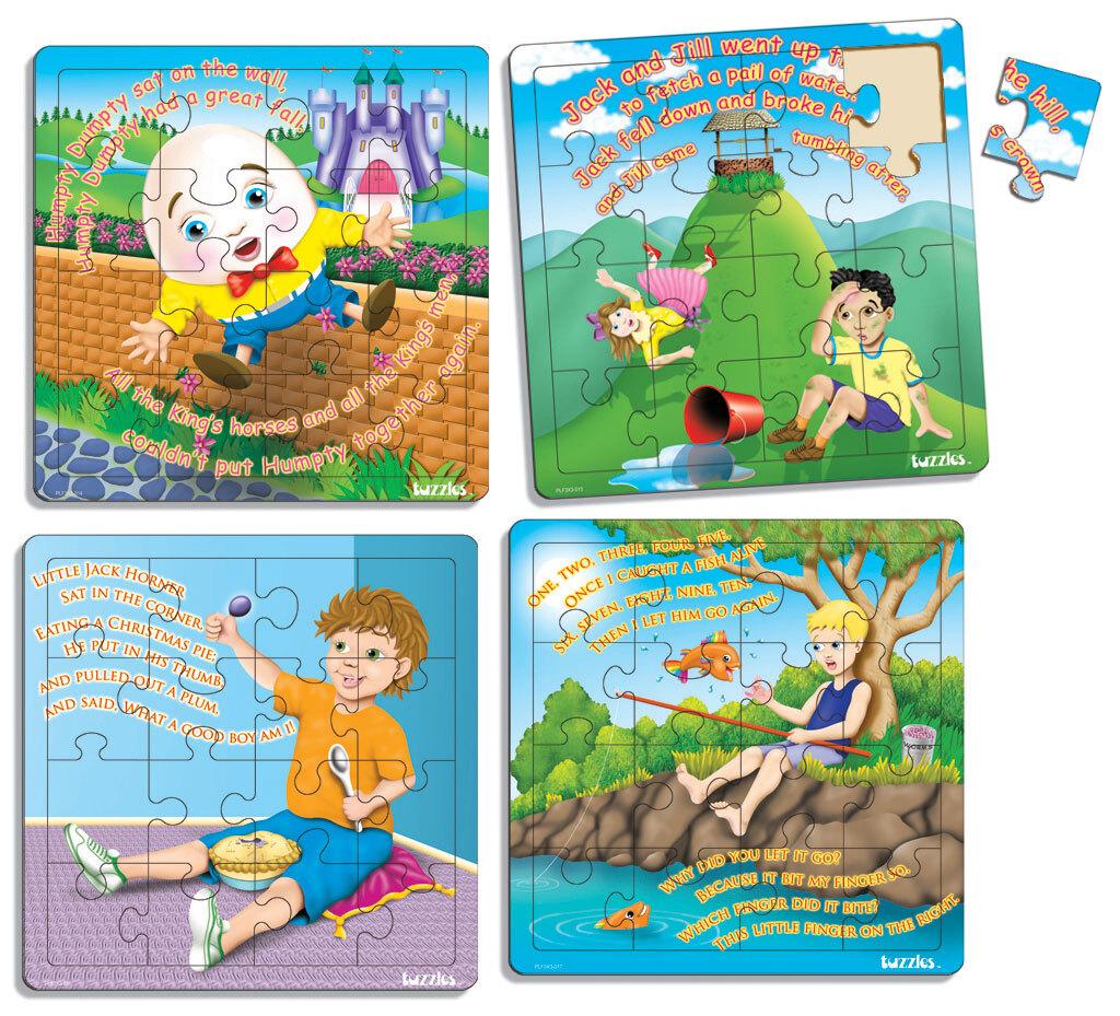 Four popular Nursey Rhymes are depicted in these Flat Tray wooden puzzles. Humpty Dumpty, Once I Caught a Fish Alive, Jack and Jill and Little Jack Horner are all favourites.