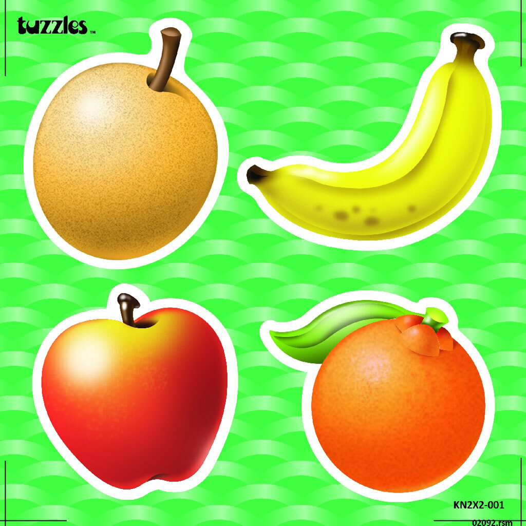 A Wooden Peg Single Piece Puzzle featuring fruit. Each piece is a slightly different shape and size which helps children to achieve success in completing this task. The fruit featured are an apple, a banana, an orange and a pear.