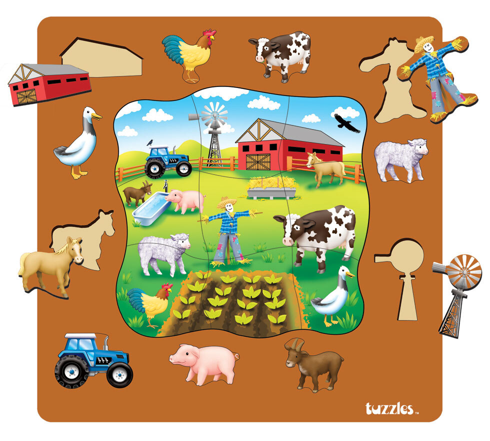 A raised piece wooden puzzle where the pieces are raised above the background to make it easier for small fingers. Male the puzzle in the center and then find the objects or things that are featured around the outside of the puzzle. A great puzzle for finding things, for social interaction and for shape recognition.