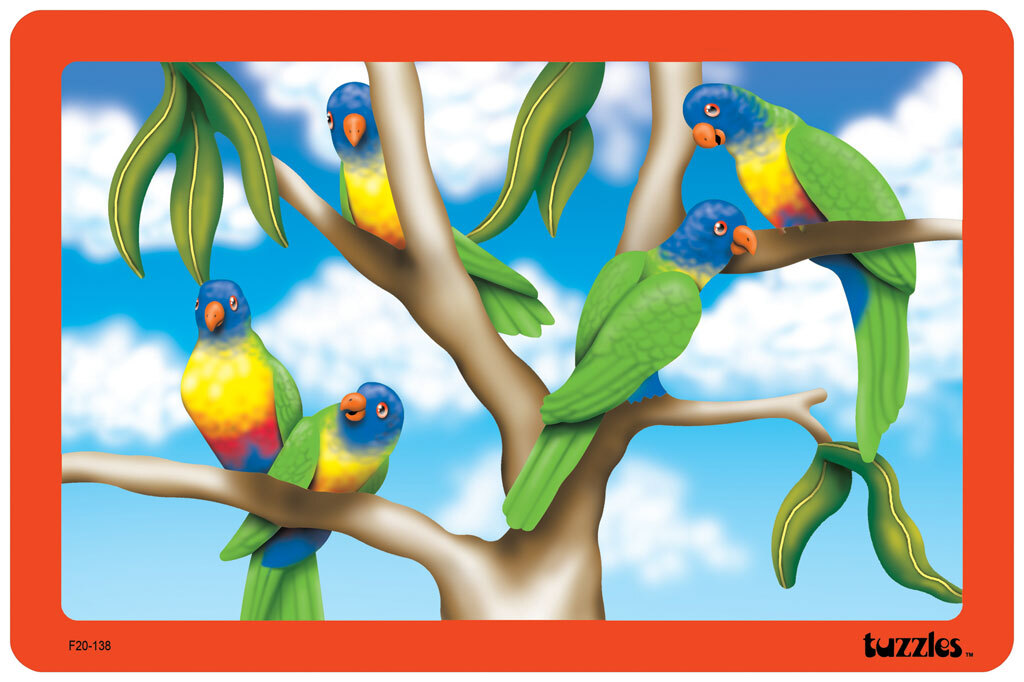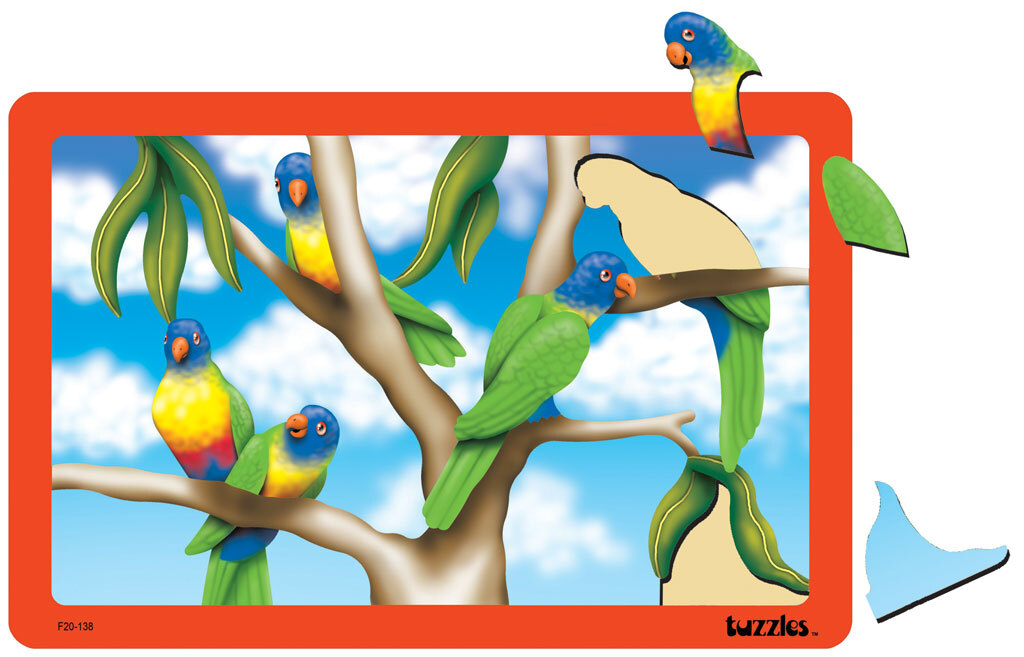 Many Rainbow Lorikeets are the feature of this Flat Tray wooden puzzle. Not having a horizon line makes this puzzle an interesting challenge and the shape cut pieces really allows children to work on spacial awareness and positive and negative shape recognition as well as fine motor and other very important learning skills. Bright and colourful, this puzzle is a delight to do over and over again.