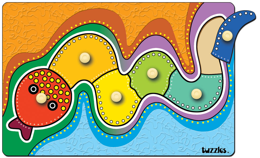 This 6 piece wooden Rainbow Serpent Peg Puzzle is a great puzzle because it has pieces of almost the same shape but they are different in size. The tail and head give some clues, but the middle section has been designed as a small challenge for the young puzzler. This bright and colourful image will also encourage discussion, helping with language development.