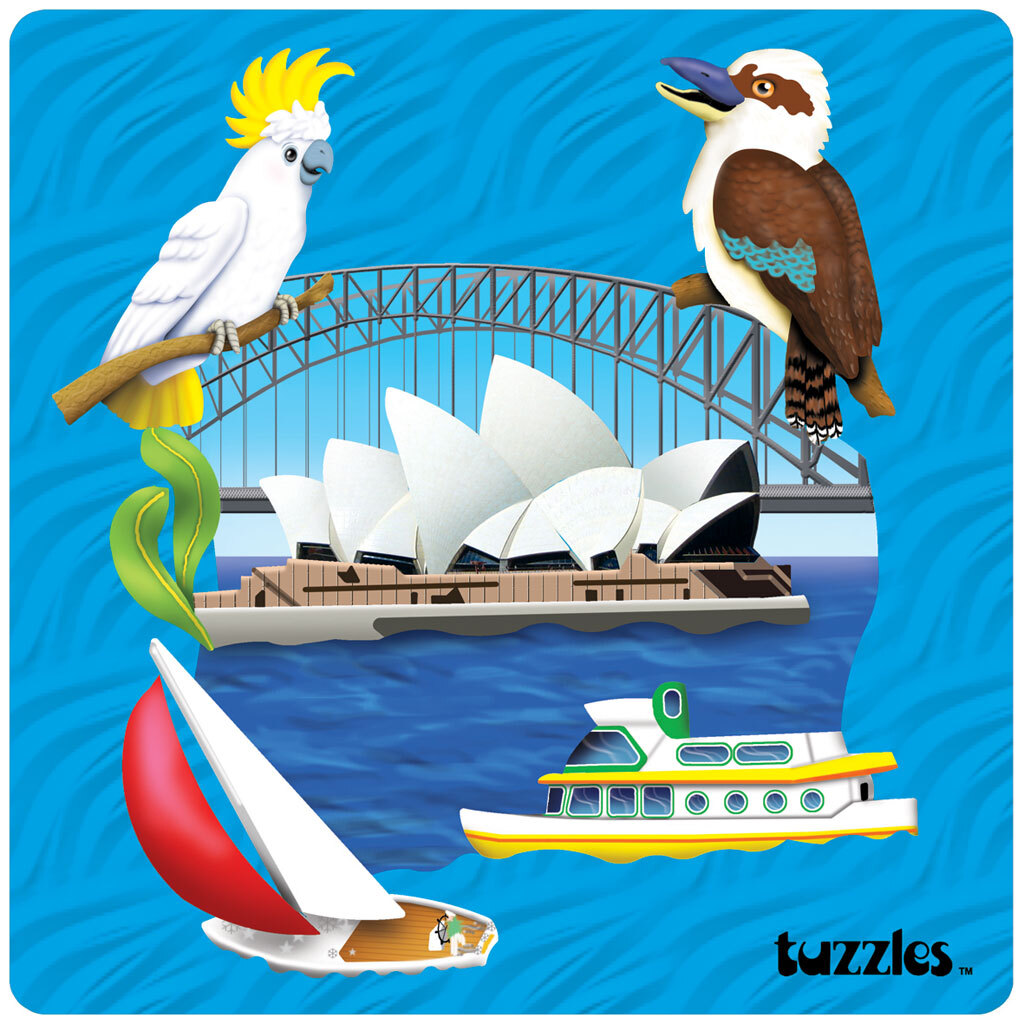 Flat Tray Puzzle with a recognisable city skyline showing the diversity of life in Australia including some of our native inhabitants.This puzzle depicts the animals most likely to be seen in a inner city setting all nestled together to make an enjoyable puzzle experience. The shape cut pieces help teach children about spacial awareness and positive and negative shape recognition. The uneven inside border of the frame helps with some "clues" to help with this. The distinctive shapes make this puzzle a great next puzzle after Raised puzzles and don't forget to "Tip and Turn" - these instructions are on the back of every Tuzzles puzzle.