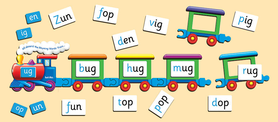 1 main Engine and 5 carriages all interchangeable jigsaw puzzle pieces. 5 engine tiles and 50 separate rhyming word tiles. The Carriage tiles go face up on the table, select and Engine tile, sort the carriage tiles to match the engine tile. When all the tiles are in place, ask the children to call out the rhyming words as fast as they can. Change the sequence and do it again, sometimes faster rhyming works better. All the instructions come with each game.