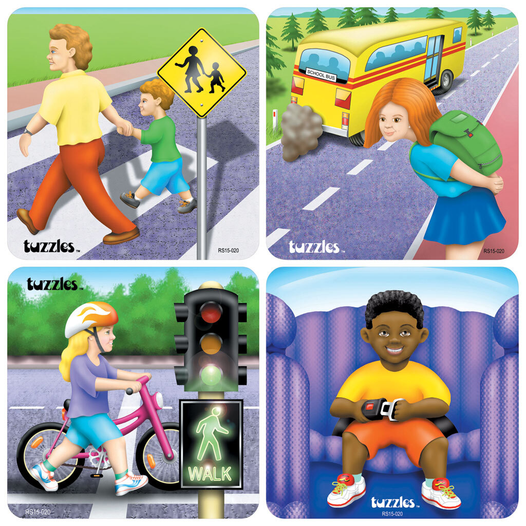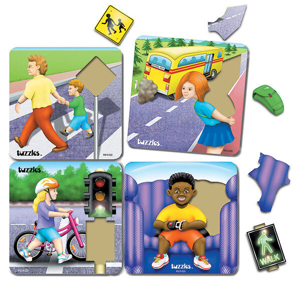 Each of the 4 raised puzzles in this set of 4 puzzles is a challenge in itself. The pieces have been raised above the background for ease of manipulation. This Set of 4 Roadsafety Puzzles features, Crossing the Road Safely, Looking before crossing the road, Wearing a seat belt and Bike safety.