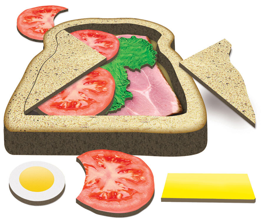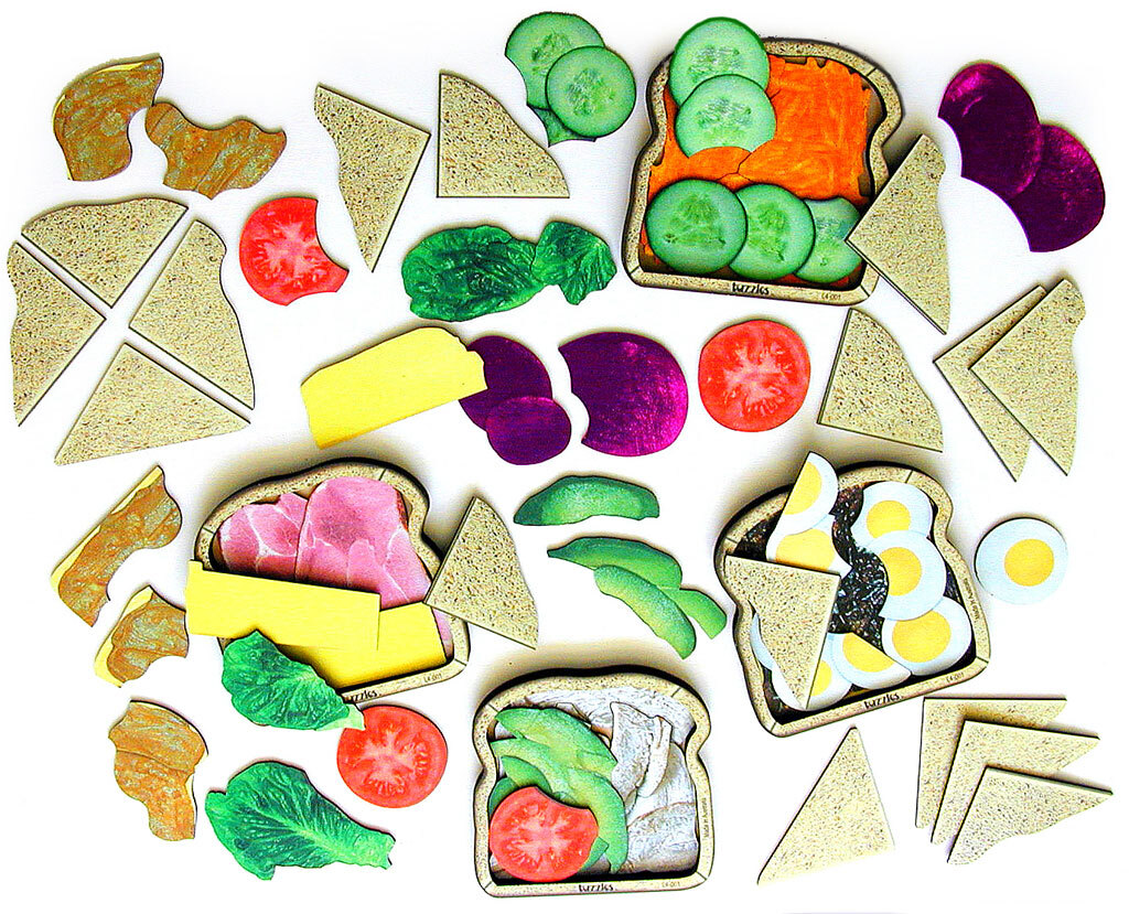 This sandwich puzzle contains 4 layers of fillings which are interchangeable, so children can choose their favourites and create their own individual sandwich. Each Puzzle comes as a set of 4 sandwiches with a total of 12 sliced, grated and spreadable ingredients: ham (2 pieces), lettuce (3 pieces), tomato (4 pieces) ,cheese (3 pieces), egg (4 pieces), chicken (4 pieces), cucumber (3 pieces), carrot (3 pieces), beetroot (3 pieces), avocado (4 pieces), vegemite (5 pieces), and peanut butter (5 pieces). There are 47 pieces all together including 4 triangles of healthy grain bread as the lid.