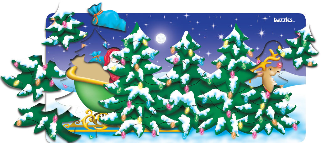 A 2 layer puzzle depicting Santa in his Sleigh underneath with a lovely landscape of Fur trees on top. This puzzle having 2 layers allows the child to explore near and far or what is behind and the Tuzzle cut pieces makes this puzzle a challenge as children have to see the shape both positive and negative to get the pieces into their correct locations. A fun and interesting puzzle.