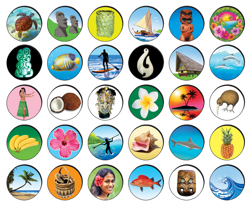 A set of 30 individual classroom locker symbols depicting a combination of traditional artwork styles from the South Pacific Region. These circular wooden symbols will help students to easily recognise their allocated storage area or classroom utensil.