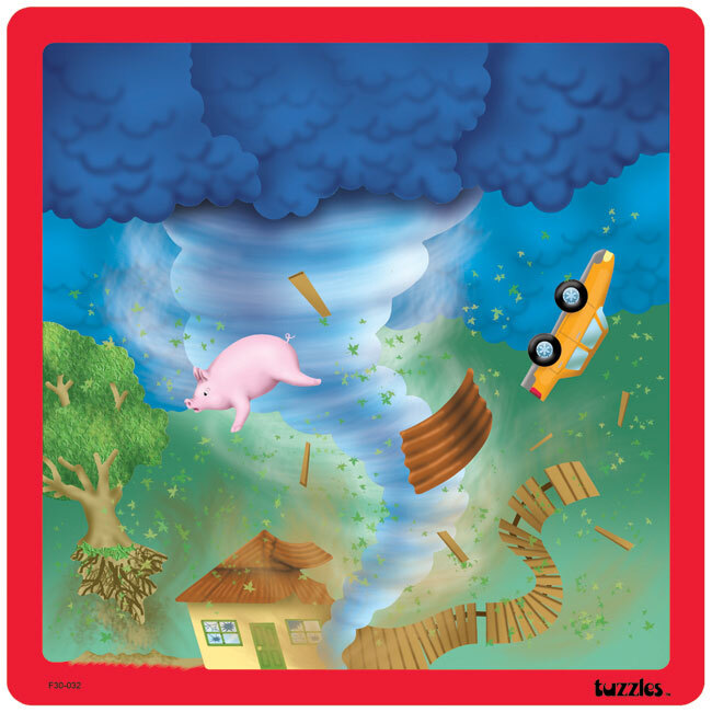 This Flat Tray Wooden puzzle is another selection from our disasters series. The Storm is ranging and it is pulling all the articles into it's vortex. This shape cut puzzle will be a challenge for the student an the subject matter is a good learning tool when studying our world.