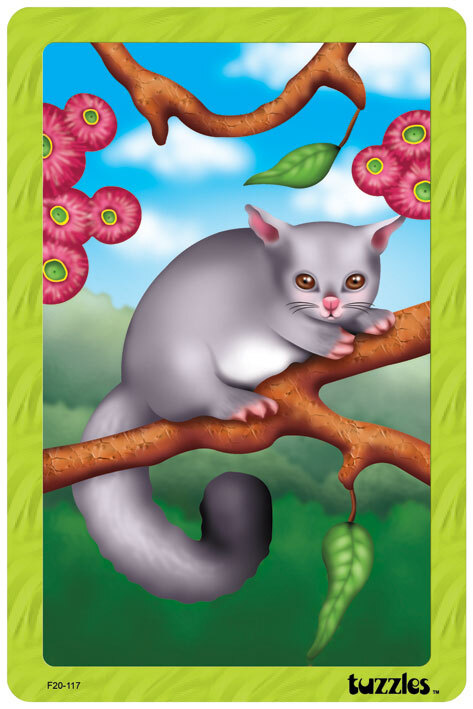 This Flat Tray wooden puzzle depicts a Sugar Glider .The sugar glider is a small, omnivorous, arboreal, and nocturnal gliding possum belonging to the marsupial infraclass. The common name refers to its predilection for sugary foods such as sap and nectar and its ability to glide through the air, much like a flying squirrel. This puzzle has shape cut oieces which helps students learn about positive and negative shapes and this also makes the puzzle a great challenge.