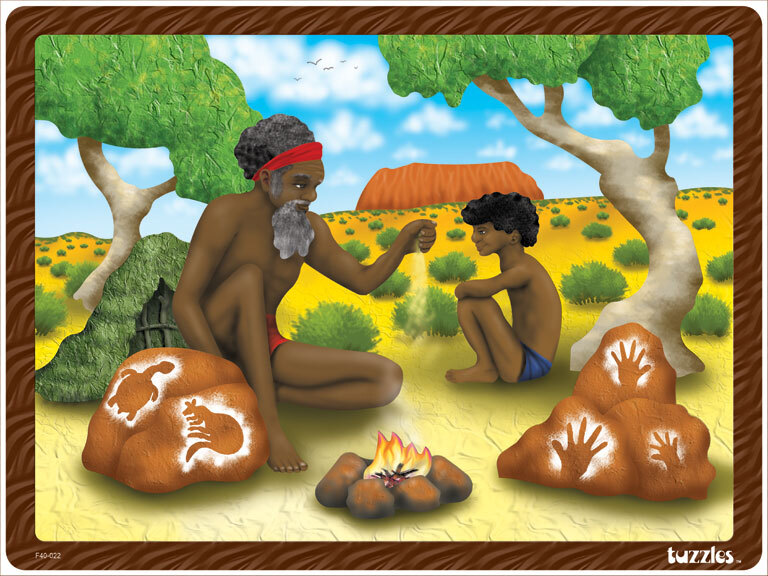A Flat Tray wooden puzzle depicting an Australian Aboriginal elder passing on the stories (the history) of the people to a child. The Storyteller is a shape cut puzzle which means that it is more of a challenge than a traditional cut jigsaw puzzle. The shape pieces help children learn spacial awareness as they have to first find the negative space and then match it with the positive shaped piece. All the pieces come out leaving just a narrow border and the tray gives the student a space to work within. But remember to "Gently Tip and Turn" the pieces out of the frame. Please read the care instructions on the sticker on the back of all Tuzzles tray products.