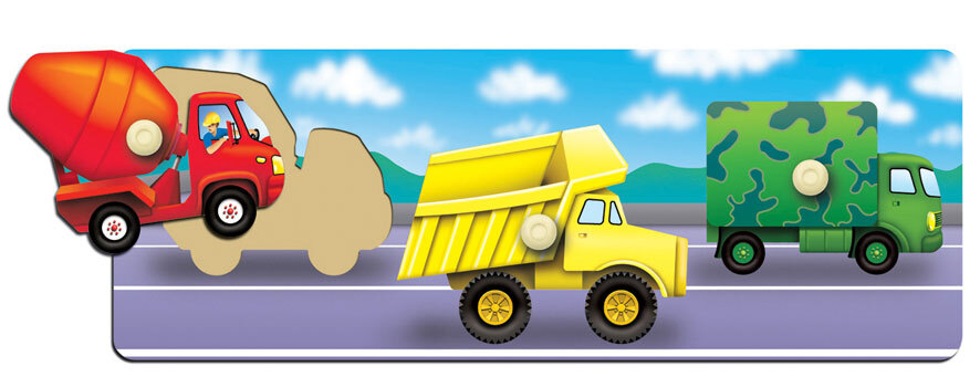 A three vehicle peg puzzle with a Transport theme. This bright and colourful puzzle is an excellent first choice for a beginning puzzler. The images are bright and colourful and the easy grip pegs make it easier for small hands to locate the pieces. This puzzle is made from wood sourced from renewable resources . This is an excellent early learning tool.