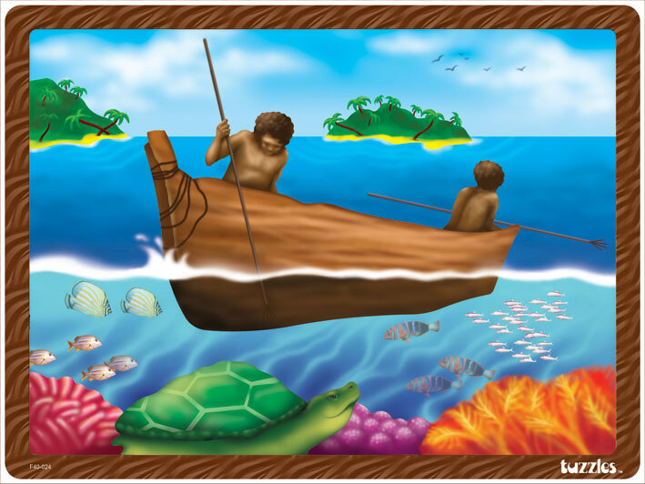 A Flat Tray wooden puzzle depicting traditional hunting. The Turtle Hunter is a shape cut puzzle which means that it is more of a challenge than a traditional cut jigsaw puzzle. The shape pieces help children learn spacial awareness as they have to first find the negative space and then match it with the positive shaped piece. All the pieces come out leaving just a narrow border and the tray gives the student a space to work within. But remember to "Gently Tip and Turn" the pieces out of the frame. Please read the care instructions on the sticker on the back of all Tuzzles tray products.