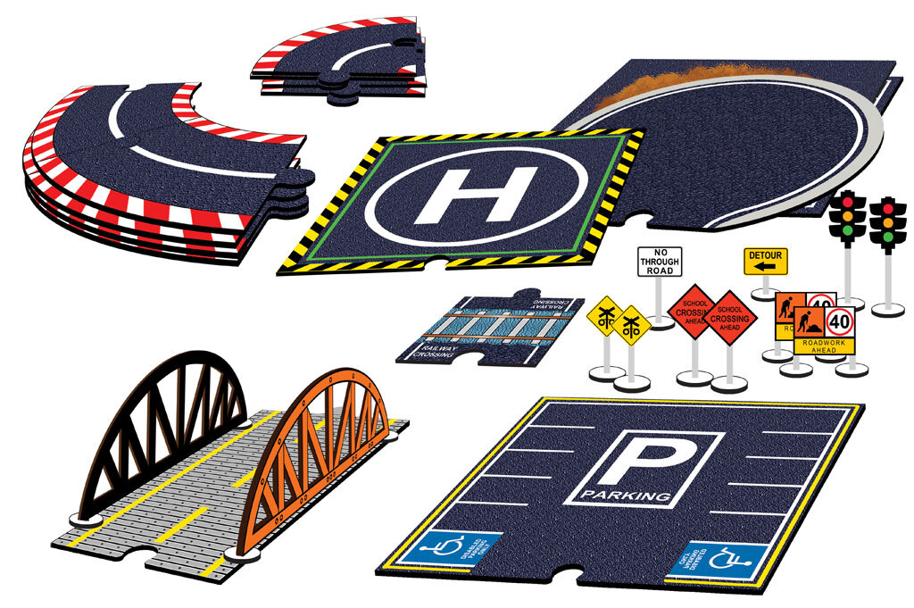 The expansion pack allows extra curves to be inserted, parking lots, cul-de-sac's, roadworks, detours, bridges, short cuts and even helicopter pads. This allows the children to really develop a total play experience. Designed for realistic play, the Super Roadway is perfectly scaled to accommodate typical die-cast model cars.