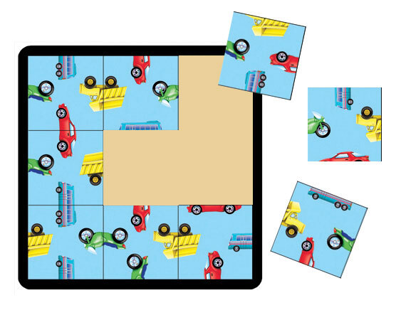 A Grid cut Move and Match Game featuring vehicles. The pieces are cut into perfect squares and will fit into the frame in any direction and any location so that student has to work out the correct orientation and placement of each piece to complete the game.