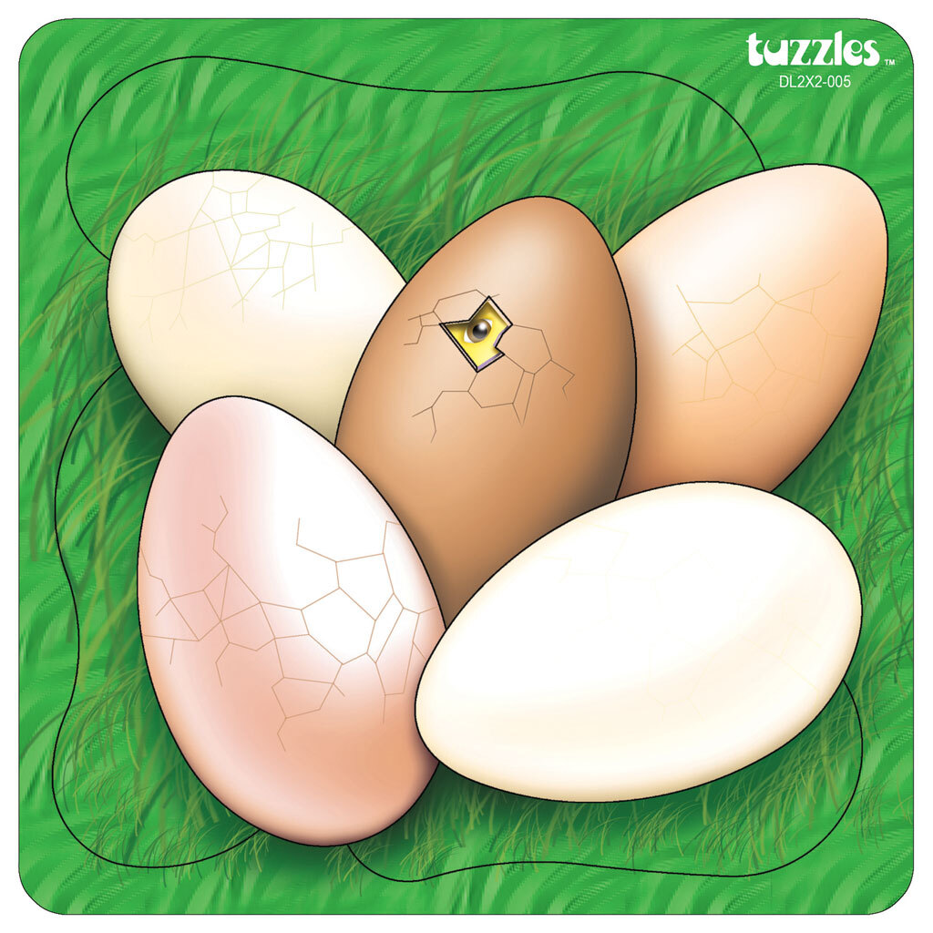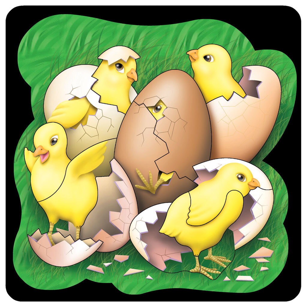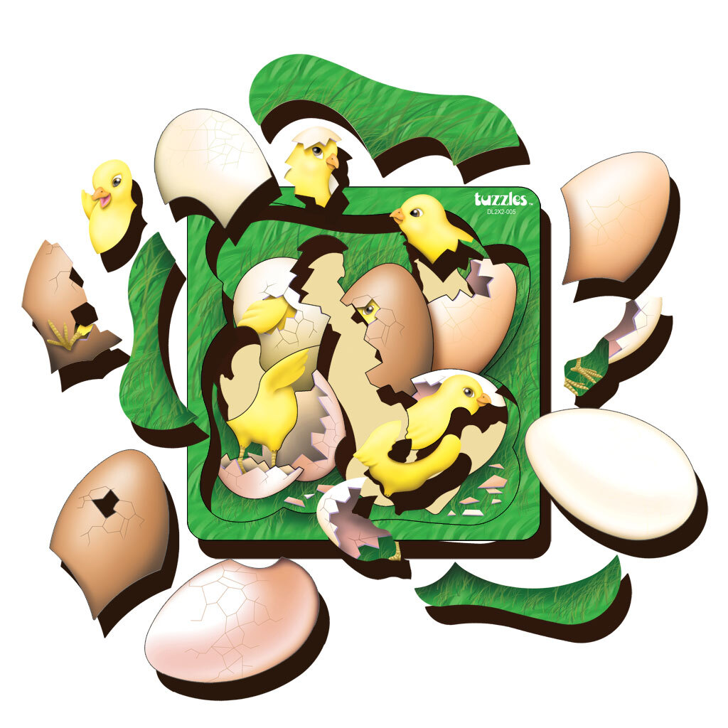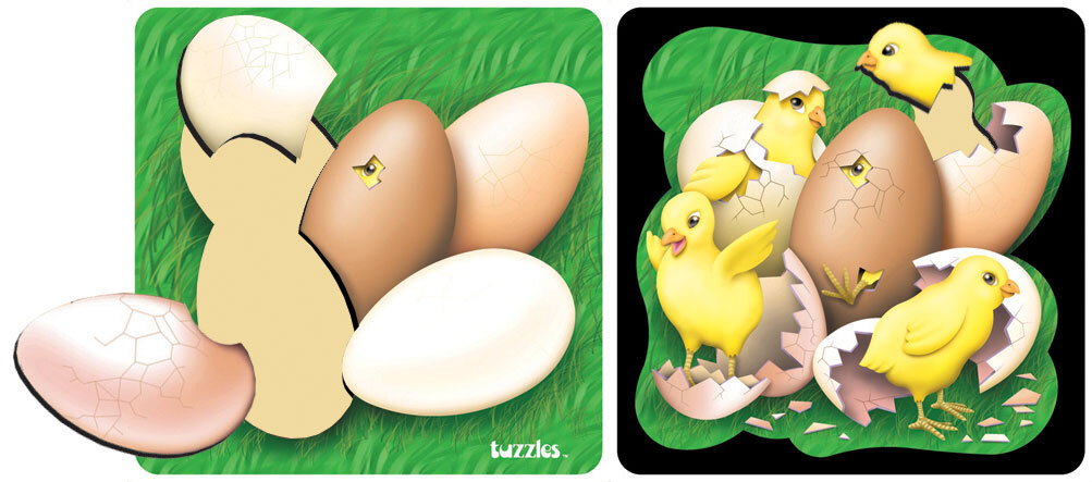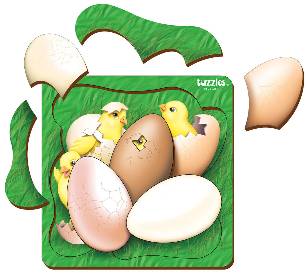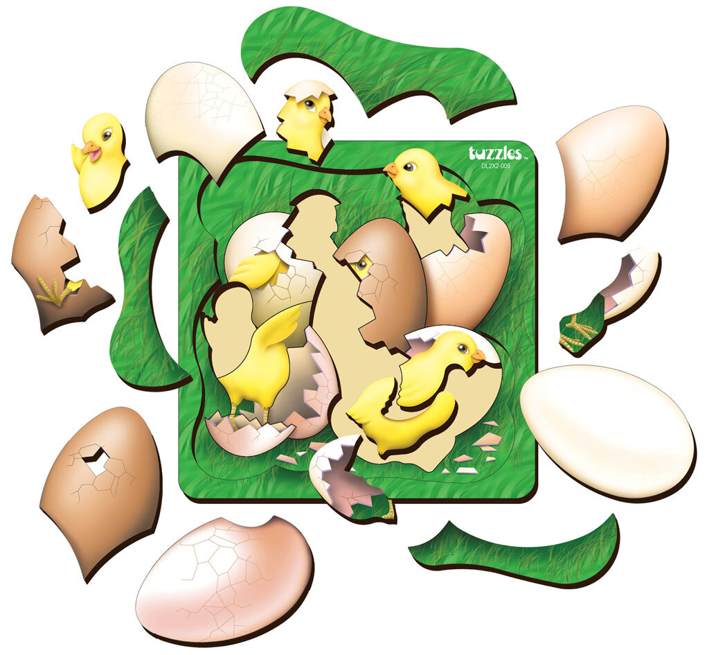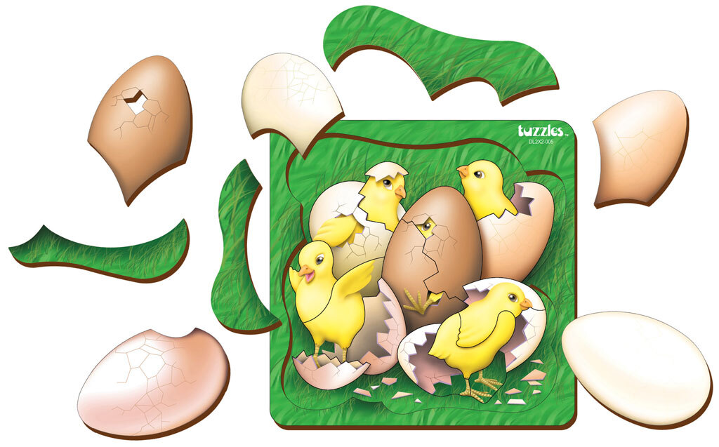 A 2-layer flat tray puzzle depicting baby chickens hatching from different coloured eggs. The Who Comes from an Egg series of puzzles are part of our Discovery range of puzzles where the children not only practice their fine motor skills but also learn about nature. This puzzle with it's cute little chickens will delight them and encourage active participation in this very important activity.