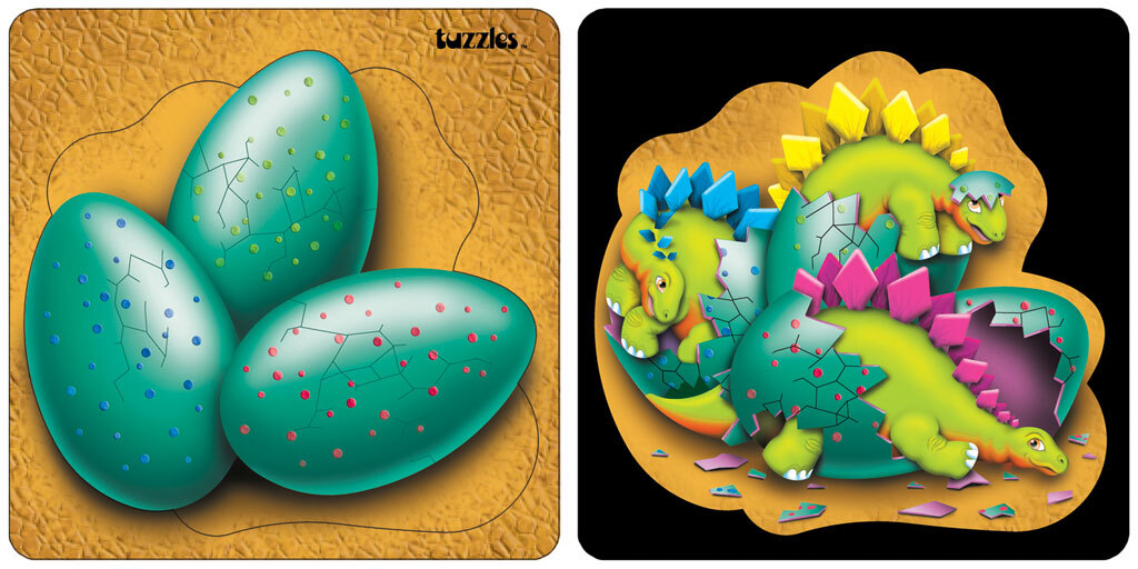 Double Layer Stegosaurus dinosaurs are emerging from their eggs. Tuzzles discovery puzzles not only help children to improve their puzzle skills but also are a great introduction to understanding science. The pieces from both levels come out of the puzzle, so an early learner can start on just one layer.
