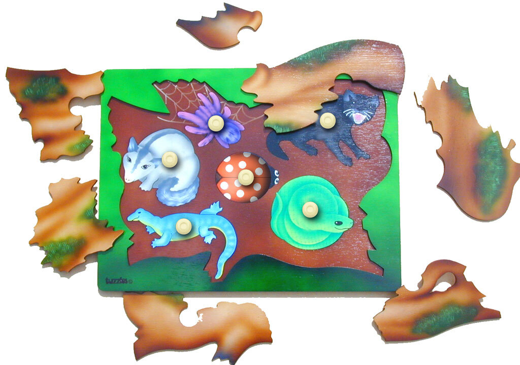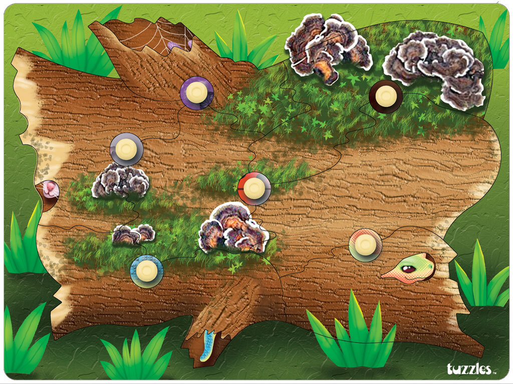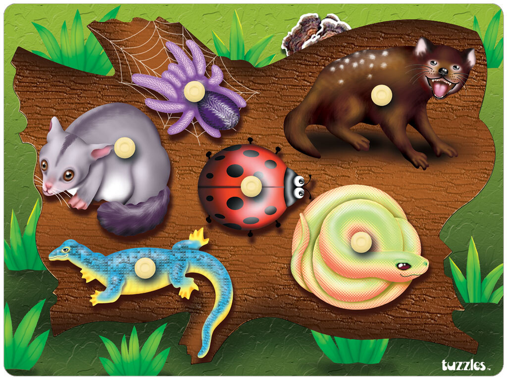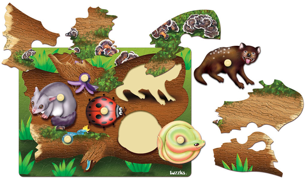 These early discovery puzzles teach children to look beneath the surface to discover what lies beneath - in this case a Log. They discover all sorts of animals that make their homes where no-one can see. It makes them aware of the other worlds beyond their immediate horizons. The two layers allow early fine motor skills practice and as they progress, the Log pieces increase the challenge. A 2 layer Discovery puzzle is a very versatile early learning tool.
